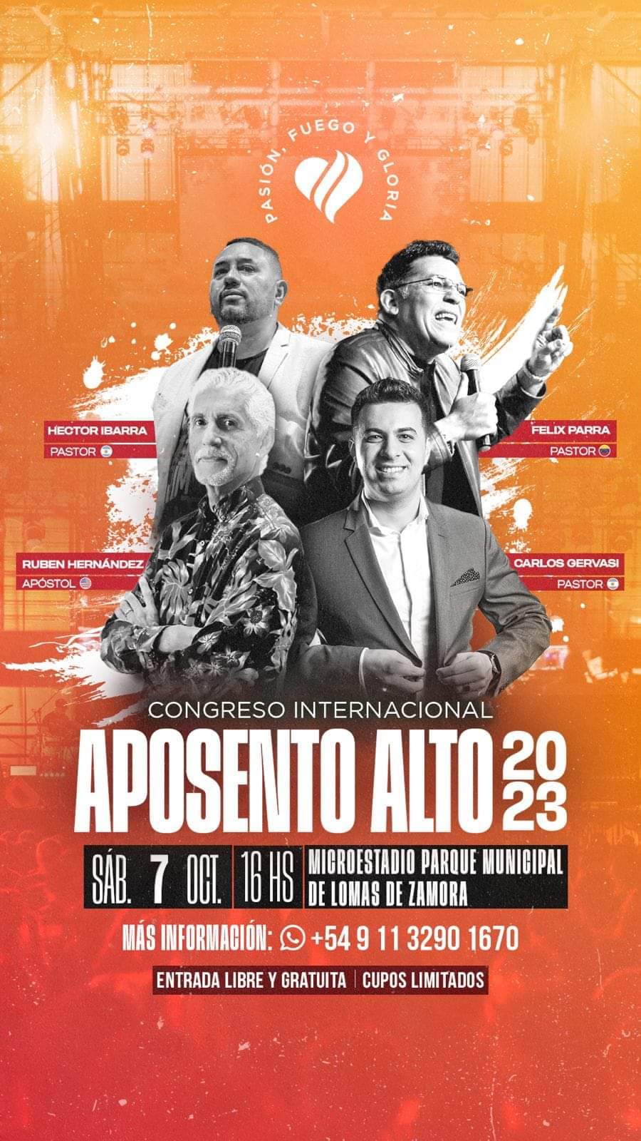 El evento Aposento alto se vuelve a realizar y este año se realiza el Sábado 7 de Octubre del 2023 Con la participación internacional del Apóstol Rubén Hernández de Estados Unidos 🇺🇸@soyrubendecido. el Pastor Félix Parra @pastorfelixparra de Venezuela, el Apóstol Hecto Ibarra @hectoribarrapastor de Argentina y la presencia del pastor organizador, el Pastor Carlos Gervasi @carlos_gervasi de Argentina y junto a más de 200 pastores que llegarán de diferentes provincias y países junto a sus congregaciones para ser parte de este gran evento.