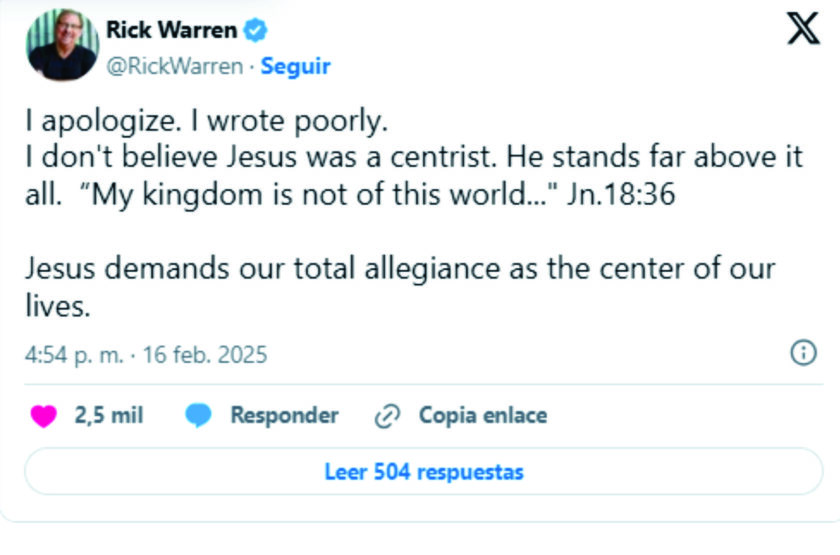 Tras las críticas Warren borró su polémica y días meditando cómo salir del lío, el pasado lunes en el que expresó «Me disculpo. Escribí mal.No creo que Jesús fuera centrista. Él está muy por encima de todo. “Mi reino no es de este mundo…” Jn.18:36.Jesús exige nuestra total lealtad como centro de nuestras vidas.